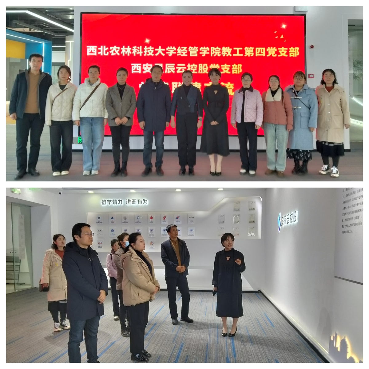 第二站,黨員同志們來到校友企業(yè)西安星辰云控股集團(tuán),在集團(tuán)董事長(zhǎng)助理、黨支部書記、MBA校友趙聰陪同講解下,實(shí)地參觀了企業(yè)數(shù)字化展廳,詳細(xì)了解企業(yè)發(fā)展歷程、核心業(yè)務(wù)與科技創(chuàng)新成果。座談交流中,雙方圍繞非公黨建、黨員發(fā)展、企業(yè)文化建設(shè)、科技成果轉(zhuǎn)化、創(chuàng)新及人才培養(yǎng)等進(jìn)行了深入探討,為進(jìn)一步推進(jìn)產(chǎn)學(xué)研融合、提升管理教輔服務(wù)水平提供了新思路。